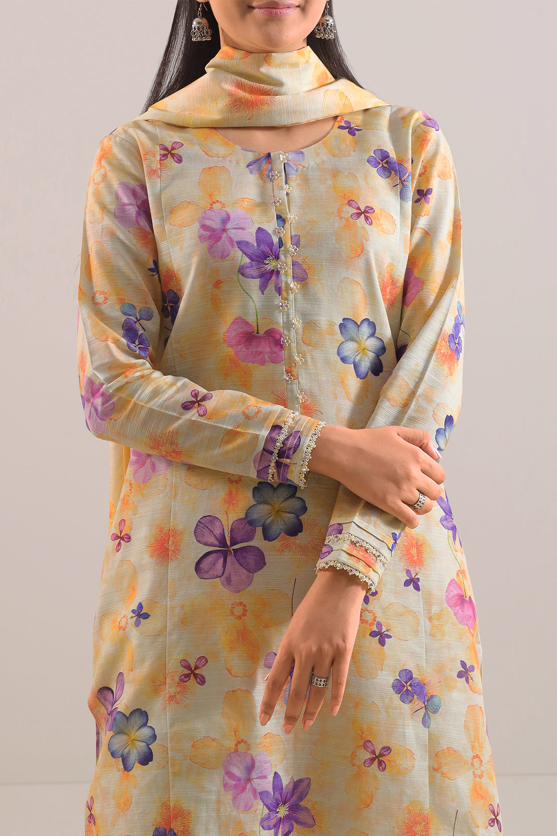 A radiant yellow lawn suit with a captivating all-over paisley and floral design on feather-light, breathable fabric. Tailoring-friendly and versatile, it pairs well with both casual and smart-casual looks across all warm-weather occasions.